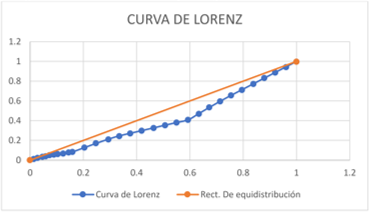 El Banco Mundial (2017) menciona asimismo que la distribución de ingresos de una economía y la distribución perfectamente equitativa es calculada por el índice de Gini, donde 0 representa una equidad perfecta y, por el contrario, 1 representa una inequidad perfecta. Por su parte, Buccioni (2012) menciona que la curva de Lorenz o curva de concentración es una gráfica que se deduce a partir de la información suministrada para el cálculo del índice de Gini y que, por tanto, refleja la mayor o menor concentración en la distribución de una magnitud.