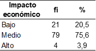 Se observó que el 75,6 % de los empresarios de las MYPES manifestaron tener una percepción media sobre el impacto económico en sus actividades comerciales, producto de la COVID-19 durante el año 2020 (ver Tabla 2).