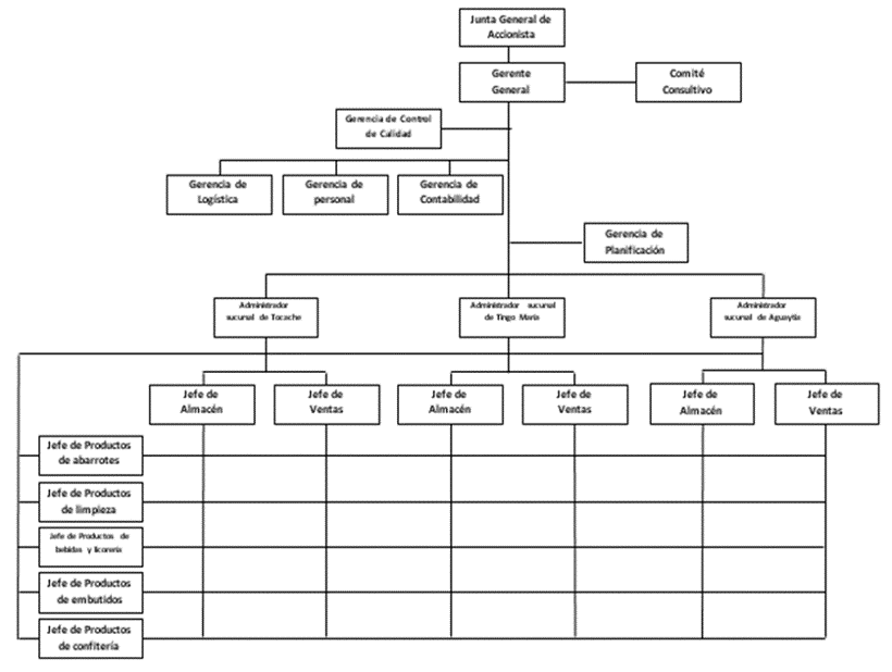 Organigrama A la hora de diseñar esta propuesta de gestión, se consideró el modelo organizacional matricial porque se identificó la unidad de línea que vienen a ser los ocupantes de la unidad orgánica, que incluyen: administrador de Tingo María, administrador de Tocache y administrador de Aguaytía. La taxonomía ergonométrica es, a su vez, matricial geográfica. A modo de ilustración presentamos el organigrama de la empresa (ver Figura 2).