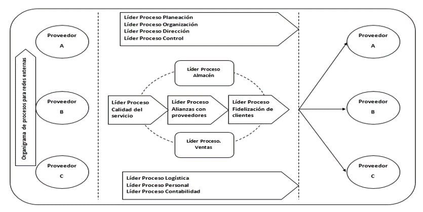Organigrama de procesos para redes externas Esta propuesta de gestión incluye un organigrama por procesos externos, el cual contempla no solo a la empresa comercial sino también a las empresas abastecedoras que están ubicadas en el margen izquierdo y a las empresas clientes ubicadas en el margen derecho. En la parte superior se ubica la alta dirección, así como el proceso administrativo; en la parte inferior se ubican los órganos de apoyo y, por último, el órgano estratégico se ubica en el centro rodeado por los órganos ejecutores. Esta propuesta de configuración del organigrama de procesos externos de la empresa Minimarket Minisol quedaría representado de la siguiente forma (ver Figura 3).