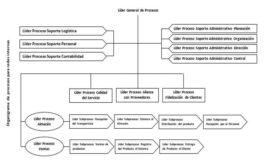 Organigrama de procesos para redes internas Para diseñar los procesos internos, esta propuesta comienza ubicando en la parte superior el órgano de alta dirección; del lado derecho se ubican los órganos del proceso administrativo y del izquierdo los órganos de apoyo; en la parte intermedia central se ubican los órganos estratégicos y, finalmente, en la parte inferior se ubican los órganos ejecutores con sus respectivos subórganos. El organigrama de procesos internos de la empresa Minimarket Minisol quedaría representado de la siguiente forma (ver Figura 4).