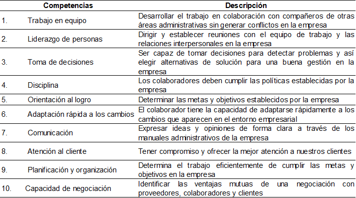 Herramienta de dirección En base a la propuesta, fueron identificadas diez principales competencias a través del Manual de puesto, luego se aplicó la metodología o catálogos de competencias, como en el caso de trabajo en equipo, liderazgo de personas, toma de decisiones, disciplina, orientación al logro, adaptación rápida a los cambios, comunicación, atención al cliente, capacidad de negociación, planificación y organización empresarial.