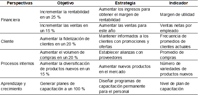 Herramienta de control Se propone a la empresa la aplicación del control a través del balanced scorecard que permitirá identificar las perspectivas de los objetivos, las estrategias y los indicadores. Esta herramienta se diseñó articulando la misión y los objetivos en cada una de las perspectivas balanceada y enfocada. El balanced scorecard para la empresa Minimarket Minisol quedaría representado de la siguiente forma (ver Tabla 5).
