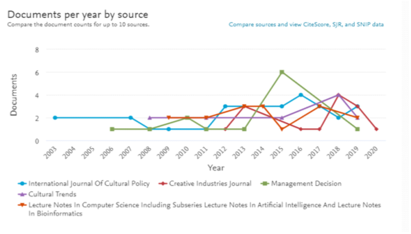 Como resultado de la dinámica de cambio respecto del interés en la temática de economía creativa, se puede observar similarmente que, con el auge de las publicaciones en esta materia, se han venido creando una serie de revistas con un enfoque particular por la temática cultural; entre las cuales resalta la revista “International Journal Of Cultural Policy” la cual, según se observa, es una de las primeras revistas orientadas a la temática cultural que se crean y aun en la actualidad continúa situándose entre las principales revistas en realizar publicaciones al respecto.