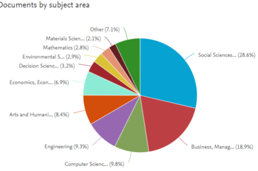 Y es en este mismo sentido que se observa que el área de estudio de economía solo contaba con un 6,9 % del total de publicaciones en la temática, de lo cual resulta interesante realizar el cuestionamiento de que por un lado, a nivel mundial, se ha reconocido la industria creativa como un elemento de significativa importancia para el desarrollo de las economías; sin embargo, según el volumen de estudios en relación al costo de este tipo de industria, permite entrever que aún existe un amplio espacio para investigaciones que permitan fortalecer la industria creativa y su rol en el desarrollo de la economía de las naciones.