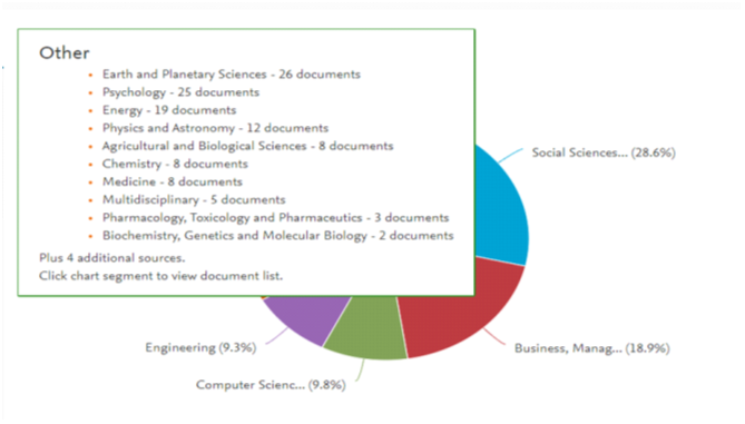 A través de la figura se ha procedido a desglosar el detalle de las áreas de estudio, las cuales han sido agrupadas en la sección de “Otros” dentro de la figura de subáreas de interés elaborado por Scopus como resultado de la búsqueda de información realizada; esto, con el fin de observar con mejor detalle algunas de las diferentes áreas de estudio que han mostrado cierto interés respecto del estudio de los costos de proyectos creativos.