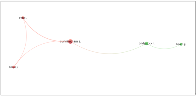 Es importante resaltar que la red de cocitacion de autores es significativamente pobre, a partir de lo cual se puede observar que los investigadores que adelantan proyectos en relación a la temática de interés aún tienen mucho trabajo por realizar en cuanto a redes de cooperación, las cuales sin duda podrían enriquecer significativamente la genera-ción de conocimiento en esta área.