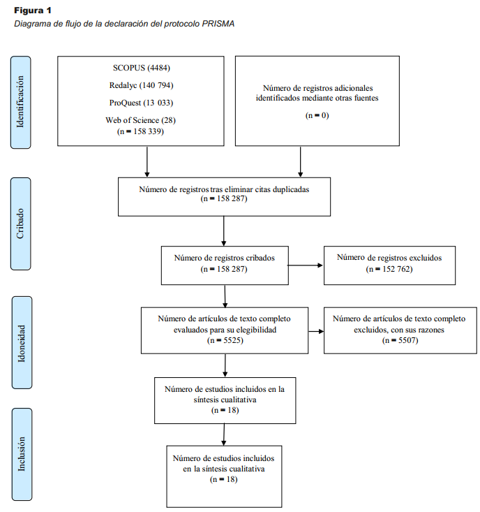 La declaración del protocolo Preferred Reporting Items for Systematic reviews and Meta-Analyses (PRISMA) 2020 se utilizó como herramienta para la elaboración del presente trabajo. Como bien lo mencionan Page et al. (2021), permitir la planificación, preparación y publicación de estudios, así como el metaanálisis contribuye a mantener la integridad de las revisiones sistemáticas, lo que facilita la comparación simultánea de varios tratamientos. Sin embargo, como se verá más adelante, fueron necesarios tanto la identificación y el cribado, como la idoneidad para este estudio. Para lograr esto, se realizó una recopilación exhaustiva en repositorios académicos, como Scopus, Redalyc, Proquest y Web of Science; todo esto en función a las cinco variables de investigación planteadas función a cinco variables de investigación: 1) año de publicación; 2) áreas temáticas relacionadas; 3) idioma; 4) tipo de documento; y 5) tipos de estudio.