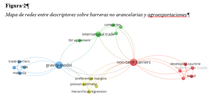 La Figura 2 proporciona una representación gráfica del mapa de redes entre descriptores sobre barreras no arancelarias y agroexportaciones. Para conseguirlo, se crea un mapa bibliométrico compuesto por nodos, que surge a partir del empleo del software VOSviewer. De esta manera, por un lado la Figura 1 presenta al grupo de color verde y al de color rojo como los principales, en los que a su vez destacan las palabras clave “international trade” y “non tariff barriers”, respectivamente. Por otro lado, en un papel secundario se encuentra el grupo de color azul en donde la palabra clave que destaca es “gravity model”, seguida de términos que guardan relación con la temática abordada.