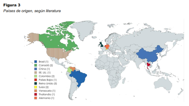 La Figura 3 representa de manera gráfica los países de origen según la literatura de cada uno de sus registros, en el cual se destaca, por la cantidad de registros, el Reino Unido, con 5; seguido por Colombia y Suiza, con 2; y por Brasil, Canadá, Países Bajos y Venezuela, con 1.