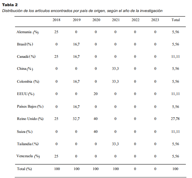 La Tabla 2 presenta la distribución de los artículos encontrados por país de origen, según el año de la investigación. En este caso, el país que presenta un mayor volumen de publicaciones con aportes al tema de investigación en los últimos seis años es Reino Unido, que lidera con un 38,46 %, seguido de Colombia y Suiza, que comparten un 15,38 % y, por último, Brasil, Canadá, Países Bajos y Venezuela, cada uno con un 7,69 %.