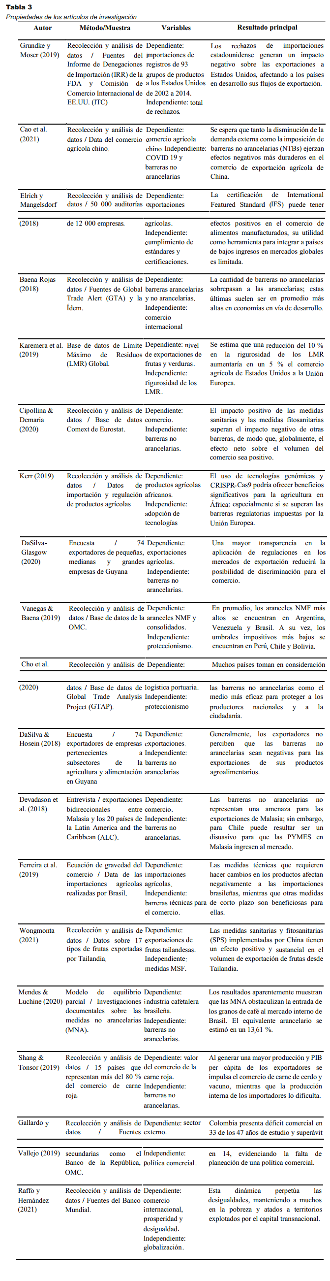 Así mismo, se llevó a cabo un exhaustivo estudio para investigar qué países han tenido un mayor número de publicaciones de las barreras no arancelarias en las agroexportaciones de Latinoamérica en los últimos seis años. Posteriormente, se identificó el año de publicación de artículos sobre dichas barreras no arancelarias. Además, se buscó conocer cuál ha sido la base de datos que más artículos ha publicado sobre las barreras no arancelarias. Por último, se procedió a delimitar las conclusiones y recomendaciones de los autores.