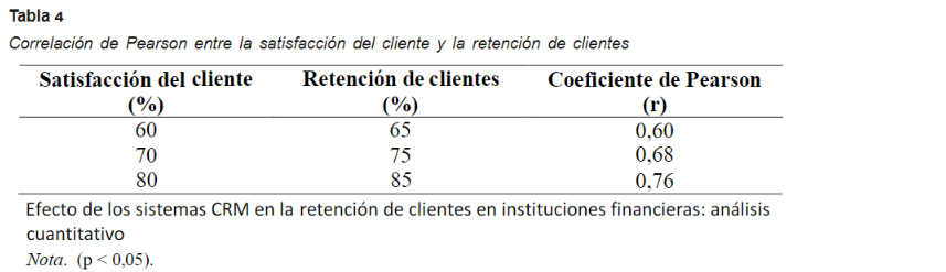 En esta investigación, los hallazgos fueron expuestos mediante tablas que resumen las conexiones entre la adopción de sistemas CRM y la fidelización de clientes, utilizando el coeficiente de correlación de Pearson (r). Este coeficiente evalúa la intensidad y la dirección del vínculo entre dos variables. Específicamente, el valor obtenido (r = 0,59, p < 0,01) revela una correlación moderada y positiva entre la implementación de sistemas CRM y la retención de clientes. Esto indica que a medida que aumenta el uso de sistemas CRM, también se incrementa la fidelización de clientes en las entidades financieras.