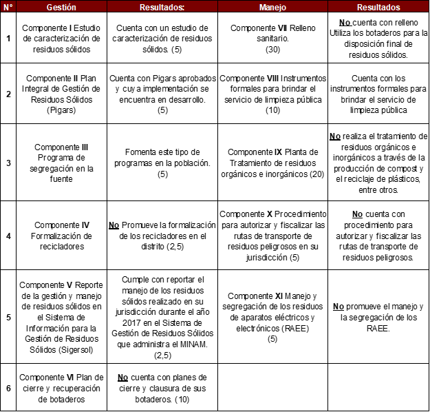 Procedimientos de investigación En la evaluación de la gestión y manejo de los residuos sólidos se tomó en cuenta los once (11) componentes determinados por el OEFA, verificándose que la municipalidad planifique y realice la adecuada gestión y manejo de los residuos sólidos municipales mediante la aplicación de una lista de verificación específica. Los componentes han sido agrupados en dos secciones, según su naturaleza. La primera aborda la gestión de los residuos sólidos y la segunda el manejo de los residuos sólidos. Componente I Estudio de caracterización de residuos sólidos. Componente II Plan Integral de Gestión de Residuos Sólidos (Pigars). Componente III Programa de segregación en la fuente. Componente IV Formalización de recicladores. Componente V Reporte de la gestión y manejo de residuos sólidos en el SIGERSOL. Y, Componente VI Plan de cierre y recuperación de botaderos.