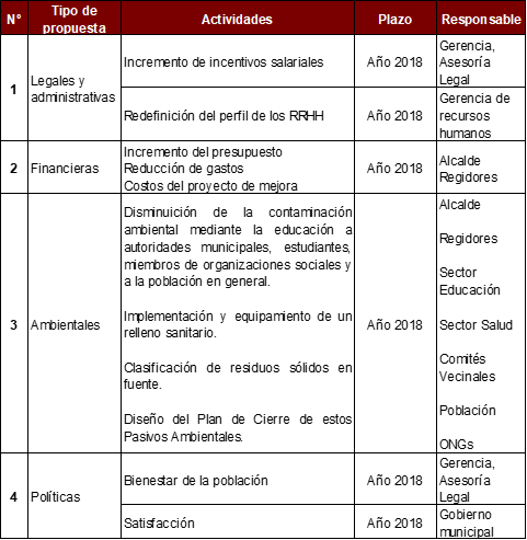 Finalmente, de acuerdo a las recomendaciones establecidas, el estudio pone en evidencia la necesidad de que en el distrito de Huacrachuco, la gestión municipal de los RS se fortalezca y que traduzca en una organización promotora de la participación de todos los niveles del sector público, las empresas y organizaciones privadas y la ciudadanía en general. Los asuntos sociales, económicos y ambientales vinculados a la gestión de RS involucran tanto a los gobiernos regionales como a los locales, al ser ellos las autoridades más cercanas a la población y sus necesidades (OEFA, 2014, p.5).