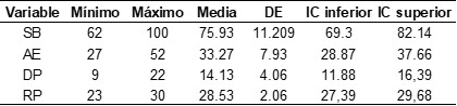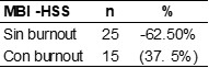 En la Tabla 4, en la escala de Maslach, los MR con SB tuvieron una puntuación general media de 75,93 ± 11,20 (entre 62 y 100 puntos), para AE de 33,27 ±7,93 (entre 27 y 52 puntos, es decir nivel ato), para DP una media de 14,13 ±4,06 (entre 9 y 22 puntos, nivel alto), para RP una media de 28,53 ±2.06 (entre 23 y 30 puntos, nivel bajo).