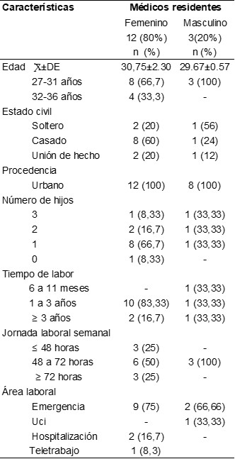 Dentro del personal médico que formaron parte del estudio, en su mayoría mujeres (60%), de la muestra total el rango de edad fue 27 a 31 años (77,5%). La edad media para femenino y masculino fue 31,04 ± 3,36 y 29,87 ± 1,25 respectivamente. Por otra parte, el 45% eran solteros, 35% casados, de procedencia urbana 95%.