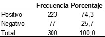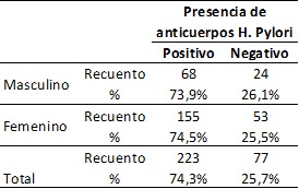 Se observa una seroprevalencia total de 74,3% (n=223) (Tabla 1), también que la mayor cantidad de pacientes que acuden a consulta por sintomatología gástrica es del sexo femenino (n=208) de las cuales un alto porcentaje presenta serología positiva para H. pylori (74,5%), un menor porcentaje de pacientes del sexo masculino acudió por sintomatología gastrointestinal (n=92) presentando también sin embargo altos porcentajes de serología positiva (73,9%) (Tabla 2). El grupo etario de mayor concurrencia fue el grupo adulto intermedio (n=117) seguido por el grupo adulto joven (n=63). (Tabla 3)