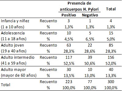 Estudio descriptivo, prospectivo, transversal realizado entre enero y octubre del 2021. Diseño no experimental. La población estuvo conformada por una muestra censal de los 300 primeros pacientes de todas las edades que acudieron a consulta médica de rutina y en campañas de salud del distrito de Villa el Salvador, dicho distrito presenta un nivel socioeconómico bajo según datos del Instituto Nacional de Estadistica e Informatica (INEI), con índices de pobreza cercanos al 30% y una población mayor de 15 años con secundaria completa de solo 62% asi como una población económicamente activa de 50,8%. Los criterios de selección fueron: ser mayores de 18 años, el presentar signos y síntomas de problemas gástricos (tales como: dispepsia, eructos, sensación de reflujo, nauseas, sensación de llenado postprandial, epigastralgia, entre otros) referir al menos de una semana de síntomas y contar con resultado serológico de prueba de detección para Helicobacter. La recolección de información se realizó por medio del acceso a las historias clínicas del establecimiento, que contaban con los resultados de laboratorio obtenidos luego de la consulta médica en el consultorio de un centro médico ubicado en Villa el Salvador, dicho centro médico, con alrededor de 15 años de antigüedad, cuenta con servicio de laboratorio clínico, farmacia, medicina general y medicina física. El método utilizado fue la detección de anticuerpos IgG IgM e IgA en sangre. Los resultados se presentan haciendo uso de estadística para identificar frecuencias absolutas y relativas. La estratificación por grupos etarios está basado en los estudios desarrollados por Levinson, quien define las etapas del desarrollo humano según el progreso social y psicológico del individuo en niños de 1 a 10 años, adolescncia de 11 a 18 años, adulto joven de 19 a 40, adulto intermedio de 41 a 59 y adulto mayor de 60 en adelante(16).
