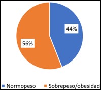 Se incluyeron 141 pacientes, la mayoría (56%) presentaban sobrepeso/obesidad en figura 1.