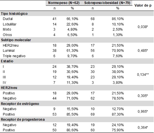 Las pacientes con sobrepeso u obesas portadoras de CM tuvieron características clinicopatológicas y pronósticas similares a las pacientes con normopeso. No se observó asociación entre la obesidad/sobrepeso y el estado de los receptores, HER2, el subtipo histológico, el estadio tumoral ni la tasa de recaída. Sin embargo, la presencia de obesidad/sobrepeso podría tener influencia en el tipo histológico de la enfermedad y en el tratamiento quirúrgico realizado.