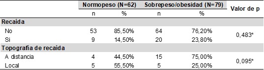 Tabla 3. Recaídas y topografía de recaída en normopeso y sobrepeso/obesidad