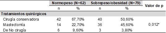 El grupo cirugía conservadora (CC) fue más frecuente en el grupo normopeso; en tanto que la mastectomía fue más frecuente en el grupo de sobrepeso/obesidad (p =0,012).