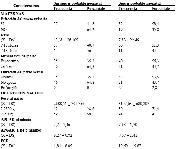 Objective: To determine the main risk factors associated with early probable neonatal sepsis. Methodology: An observational, analytical, retrospective study of cases and controls was carried out. The cases were 71 newborns diagnosed with probable early sepsis associated with one or more of the factors under study; and the control group: 71 neonates without early probable neonatal sepsis with one or more of the factors under study, the data were collected from the medical records. The bivariate analysis of the evaluated risk factors, low birth weight, infection of the maternal urinary tract in the third trimester and premature membrane rupture, was carried out through the Chi-2 test, Odds ratio with a level of confidence to 95%. For the comparative analysis of the quantitative variables, the man whitney U test was used. Results: In the bivariate analysis, maternal urinary tract infection was identified as risk factors (OR = 2.515, 95% CI = 1.246 - 5.075, p = 0.00), low birth weight (OR = 3.5, 95% CI = 1.65-7.84, p = 0.01), the premature rupture of membranes was not statistically significant (OR = 0.7, 95% CI = 0.31-1.7) Conclusions: Urinary tract infection and low birth weight were the most important risk factors in this study for the development of early probable neonatal sepsis.