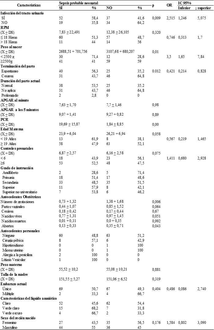 Se realizó un análisis bivariado con las variables estadísticamente significativas y se encontró que las madres de los neonatos con sepsis probable temprana que tuvieron ITU durante el tercer trimestre de gestación (OR=2,51, IC=1.24-5.07; p=0.009) y recién nacidos con bajo peso menor de 2500g (OR=3,5, IC=1,65-7,84; p=0,01) fueron factores de riesgo que más estuvieron asociados al desarrollo de sepsis neonatal probable temprana en neonatos.