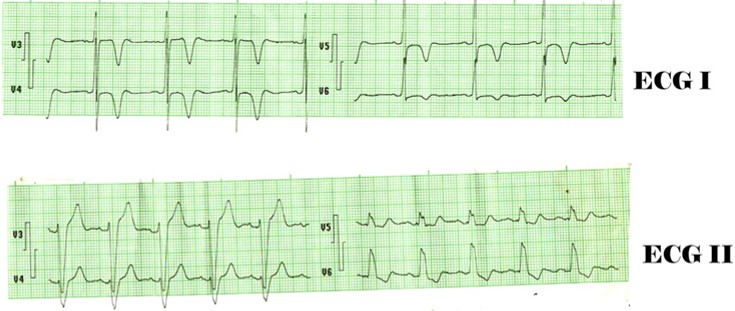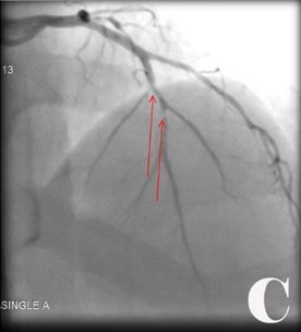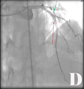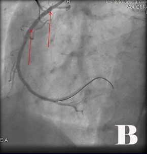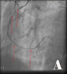 En electrocardiogramas, hubo inestabilidad como ST deprimido con T negativa, simétrica, muy profunda en toda la cara anterior (V1,V2,V3,V4,V5,V6) (ECG:I), luego bloqueo de rama izquierda (ECG:II), La troponina, la CPKMB y CPK se mantuvieron normales. El cuadro clínico se hace más intenso y peligroso en unidad de cuidados intensivos coronarios, con ángor mantenido e intenso, palidez, disnea, palpitaciones, sudoración, arritmias, disfunción sistólica de VI e inicia compromiso hemodinámico, se le administra nitroglicerina sublingual y luego intravenosa hasta 0,5 mcg/Kg/min. Se apoya con Dobutamina. En ecocardiograma: fracción ventricular izquierda (FEVI) de 36 %. Por gravedad de cuadro clínico, electrocardiográfico y FEVI, se agilizó la activación del servicio de hemodinámica. Se cumplió abordaje hemodinámico emergente y resultó (Fig.).