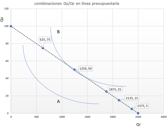 En la figura 1 los puntos (Qs y Qr) representan cantidades intercambiables (pacientes/año de tratamiento con spinraza y respiradores) bajo un presupuesto fijo algo inferior a USD 50 millones. Las curvas de indiferencia A y B, representan posibles combinaciones “preferidas” por un decisor interesado en equidad, no en maximización de vidas salvadas. La curva A es ineficiente. En B, el decisor interesado en maximizar equidad absoluta “prefiere” cubrir progresivamente más spinraza o respiradores a medida que el beneficio marginal de una unidad extra es relativamente menor.