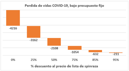 En nuestro ejercicio, el escenario de sólo tratar a 100 pacientes con AME cuidadosamente seleccionados, con un descuento del 50% equivale a un costo de 2 018 vidas de personas con COVID-19, y cada punto porcentual de descuento en el precio de spinraza salvaría a 44 vidas de personas con COVID-19. En otras palabras, un decisor que acepte pagar por spinraza a un descuento de sólo el 50%, bajo el presupuesto fijo de nuestro escenario, está efectivamente valorando cada vida de un paciente con AME, 70 veces más que cada vida de un paciente grave con COVID-19.