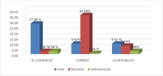La cobertura periodística realizada por los periódicos El Comercio, Correo y La República, objeto de la muestra, sobre la violencia hacia la mujer sigue centrada en la capital de Perú. De ellos, diario Correo es el que contiene mayor cobertura nacional respecto a los diarios El Comercio y la República.